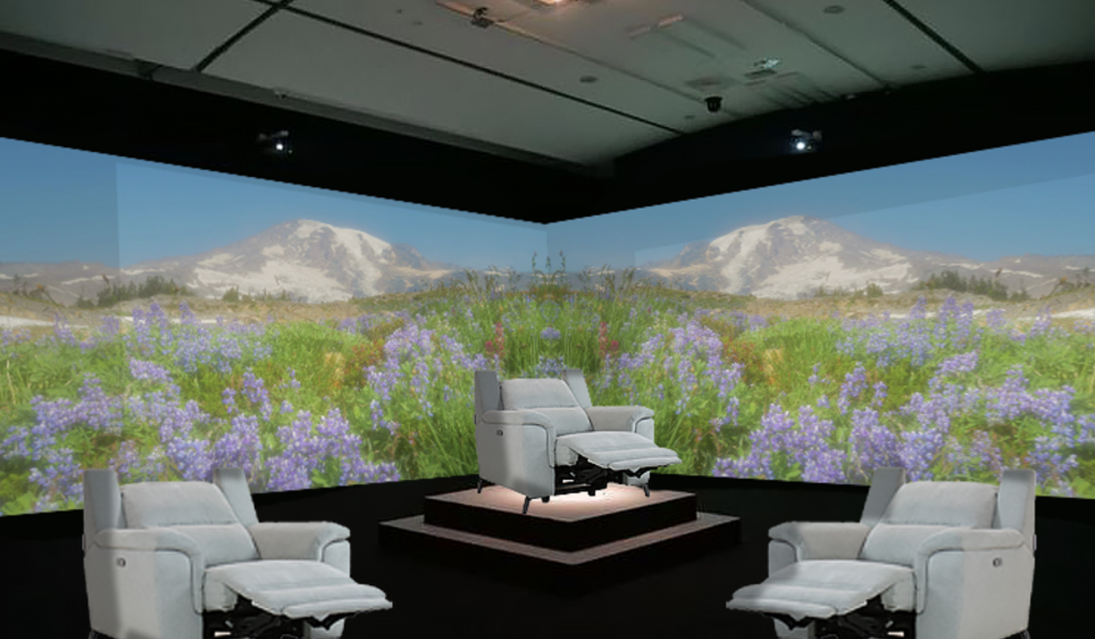 The envisioned video project would be presented in an enclosed space that projection-mapped the video above onto two of the wall spaces in the room. The space was creatively inspired by the RMIT Black Box with reclining chairs that would sync in motion to the visuals at hand. Below is a mockup of the envisioned project.